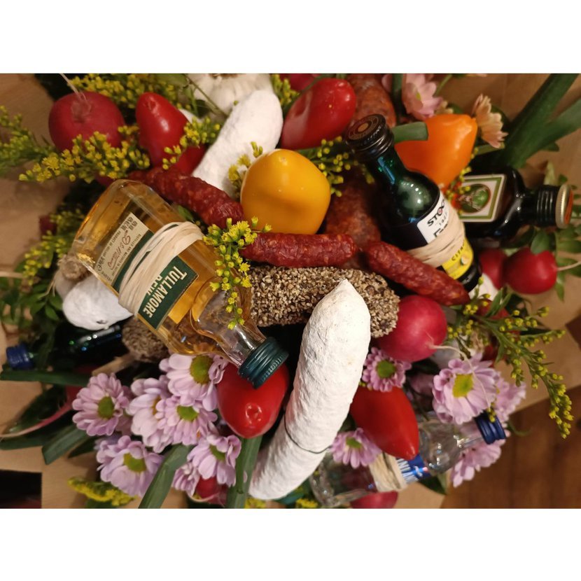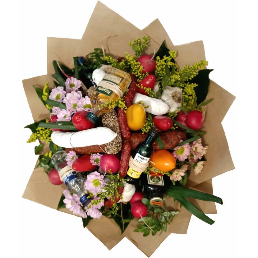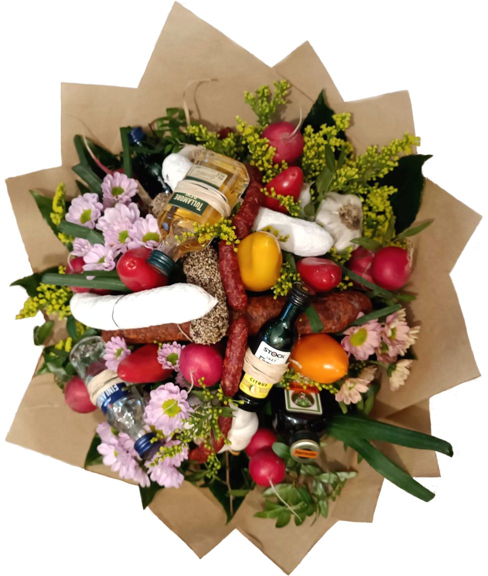 Klobásová kytice Miloš obsahuje poctivé, české a chutné klobásy z Řeznictví Lešetický a lahvičky minialkoholu. Kytice je dozdobena doplňkovou zeleninou a zelení tak, aby byla hezky pestrá a potěšila obdarovaného.